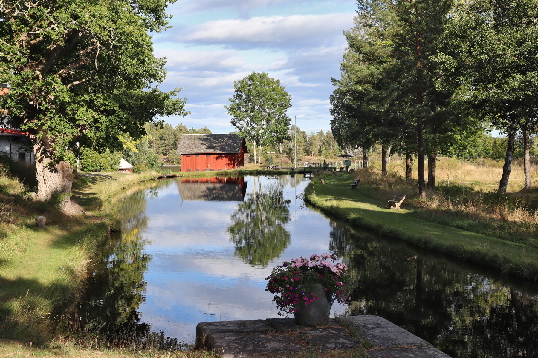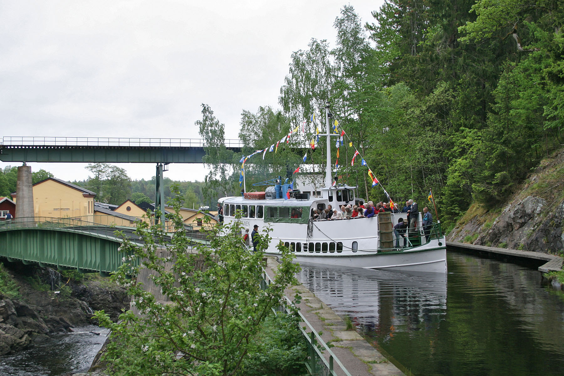 Apropos Håverud: Der kleine Ort mitten in den Wäldern zwischen den Seen Östebosjön und Åklång ist so etwas wie das touristische Epizentrum Dalslands. Wir verweilen dort immer wieder gerne. Grund dafür ist ein einzigartiges technisches Denkmal – das sogenannte Aquädukt. Die Stromschnellen, die hier beide Seen verbinden, mussten im Zuge des Kanalbaus mit einer künstlichen Wasserpassage überwunden werden, die sich zusätzlich zwischen die begrenzenden Felsen schiebt und mit einer Trogbrücke über das ursprüngliche Wasserbett führt. Zudem kreuzen hier Eisenbahn und Straße den Kanal, was eine wahrlich spektakuläre Kulisse erzeugt. Das angrenzende Kanalmuseum informiert über örtliche Geschichte, Natur, Geologie, Kanalbau und Industrie. Regelrecht abenteuerlich ist die Autoroute entlang des Kanals von Håverud nach Norden, wo die Strecke durch dichte Wälder kurvenreich auf und ab führt.