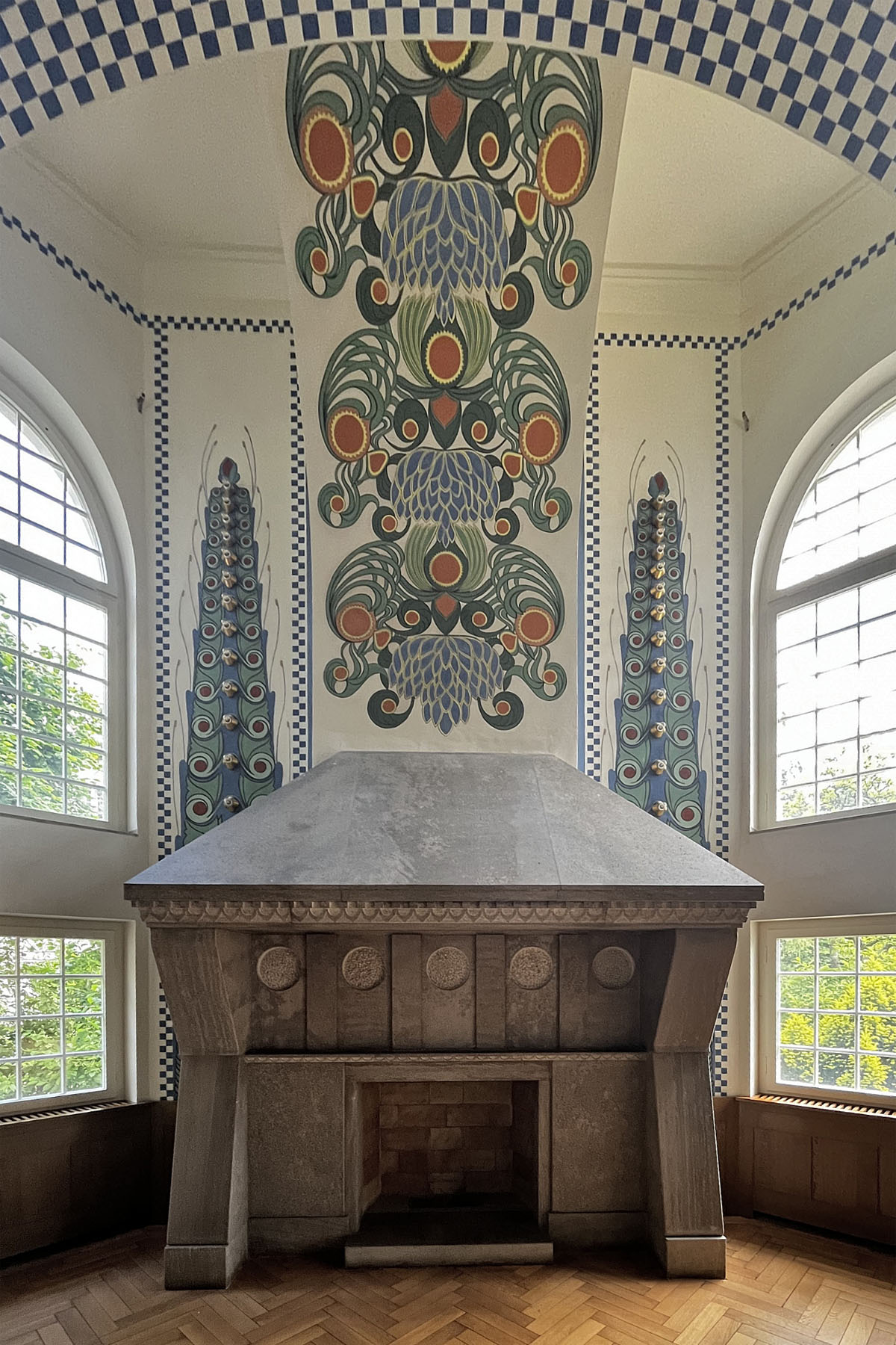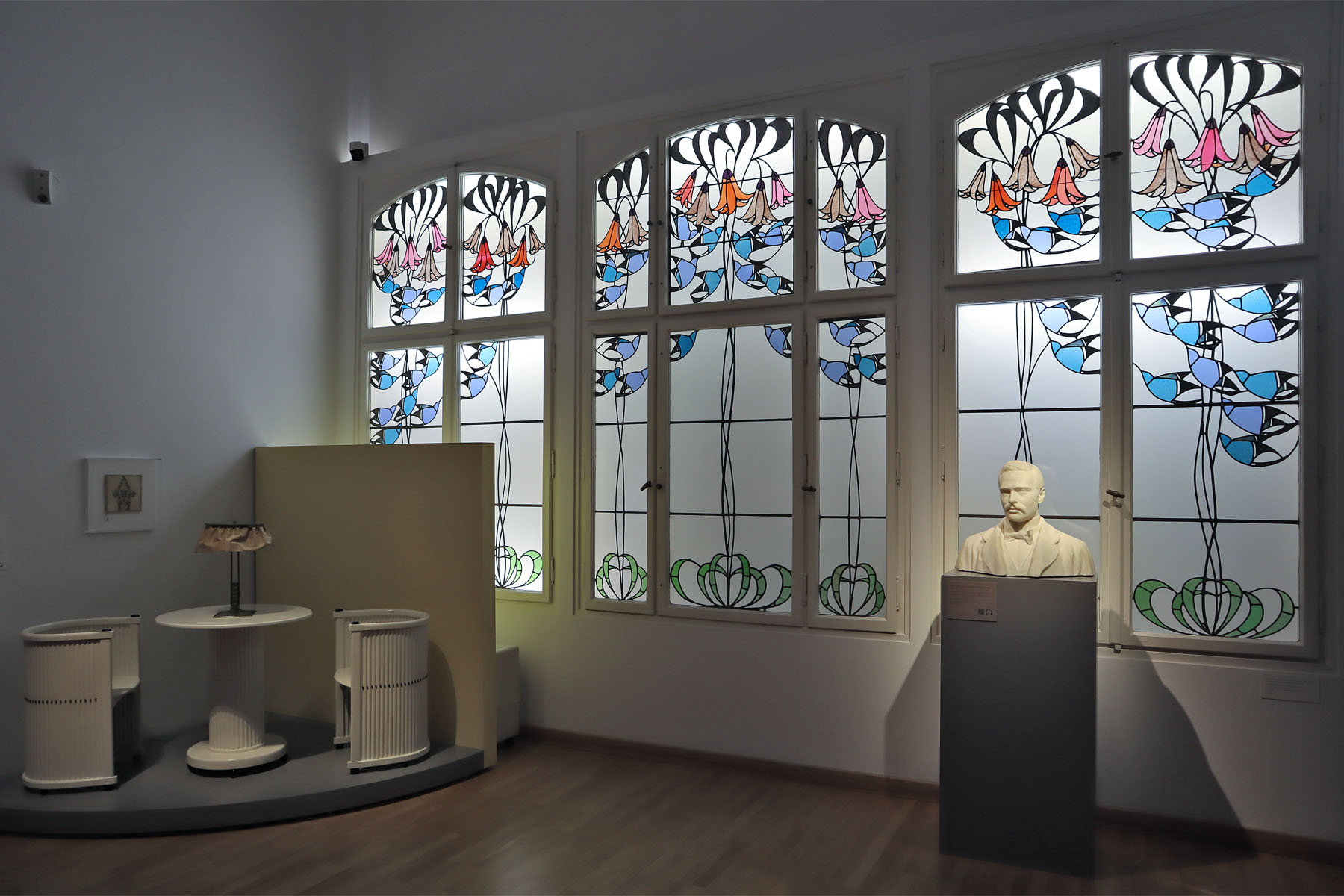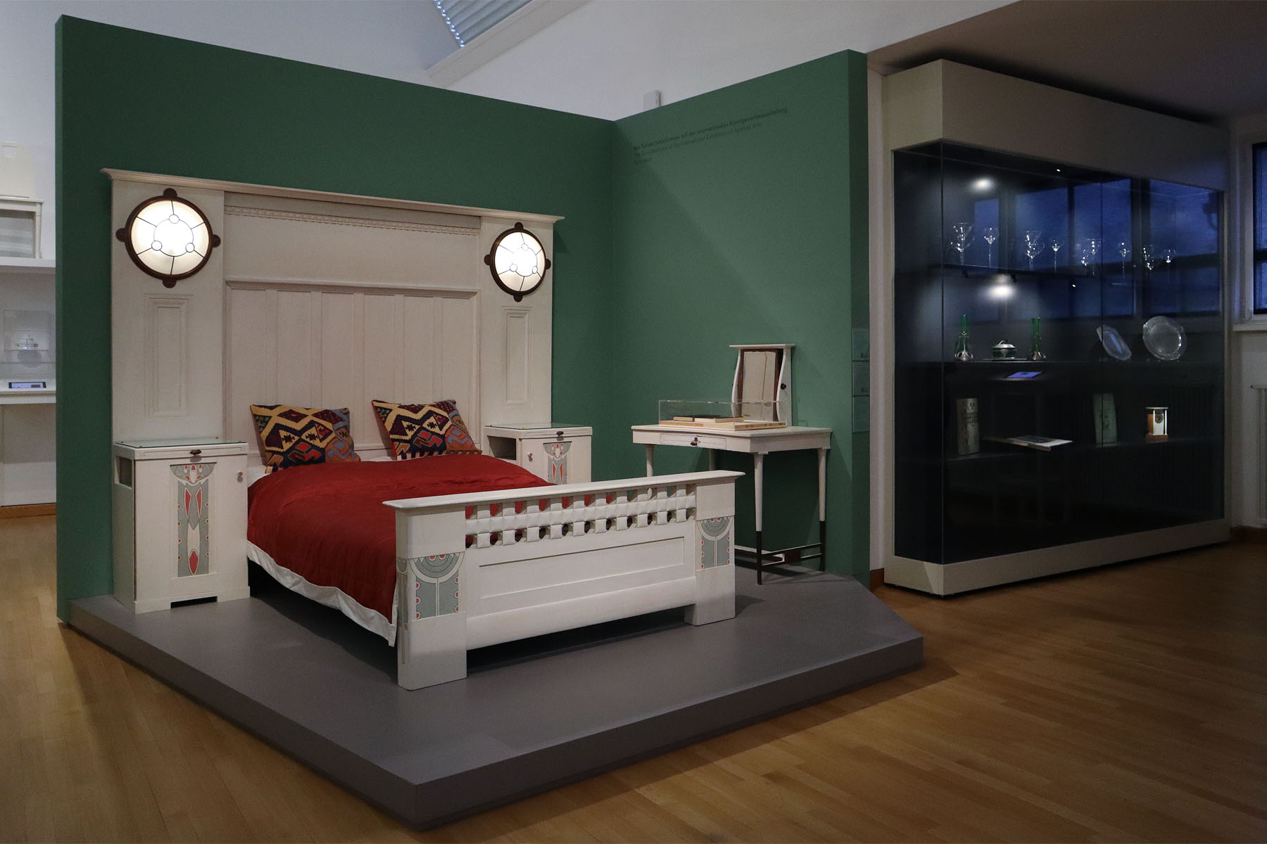 Im östlichen Flügel erwartet uns nach einer kurzen Einführung ins Design des Jugendstils ein Konvolut an unterschiedlichsten Raumensembles, die teilweise durch historische Fotos komplettiert werden. Dabei wird offenbar, dass die Mathildenhöhe kein isoliertes Phänomen war, das sich lediglich zu den eigenen Kunstausstellungen der Öffentlichkeit öffnete. Die Mitglieder der Künstlerkolonie tourten mit ihren Reformideen und Designs von Weltausstellung zu Weltausstellung: Paris, Turin, St. Louis. Doch die Darmstädter Raumkunstwerke erfüllten auch Alltagszwecke. Diese waren daher für den späteren Verkauf vorgesehen und konnten in den in dieser Zeit neu entstehenden Warenhäusern präsentiert werden.