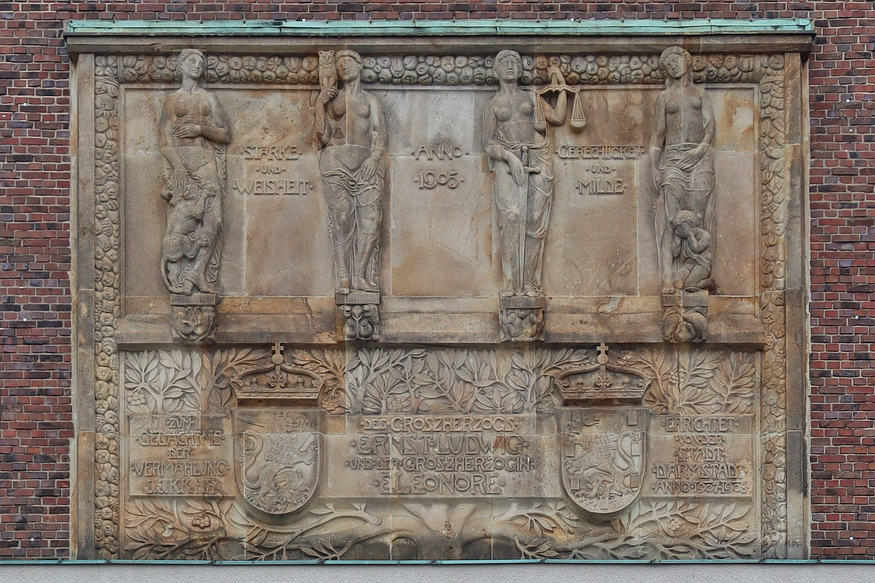 Als zentraler Bau der Mathildenhöhe bildete das hoch gelegene Ernst-Ludwig-Haus als Ateliergebäude den funktionalen Mittelpunkt der Kolonie. Der breit gelagerte, monumentale Baukörper verfügt über ein einnehmendes, goldgeschmücktes Portal mit den empfangenden Kolossalfiguren Kraft und Schönheit (geschaffen von Ludwig Habich). An keinem Gebäude der Mathildenhöhe sind die Bezüge zum Wiener Jugendstil offensichtlicher.