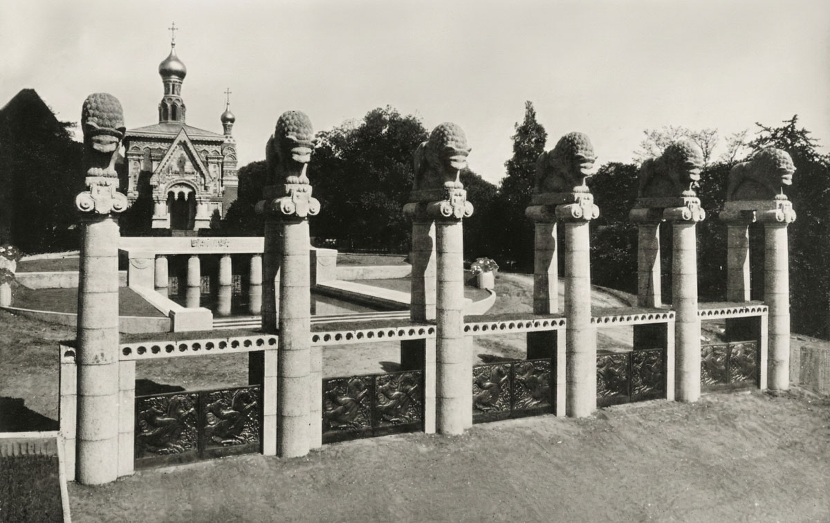 Die letzte Ausstellung auf der Mathildenhöhe im Jahre 1914 stand unter der Leitung von Müller und im Zeichen der Landschaftsgestaltung. Um die russisch-orthodoxe Kapelle als stilistisches Einzelphänomen besser in die stilistisch andersartige Architektur der Künstlerkolonie einzubinden, wurde ihr ein großes Wasserbecken vorgelagert. Die Idee selbst geht wohl auf Skizzen von Olbrich zurück, der zu diesem Zeitpunkt bereits verstorben war. Die Ausrichtung und die Fliesen des Beckens nehmen Bezug auf den Kapellenbau. Unweit entstand zudem ein Gartenpavillon (Schwanentempel), der typologisch an einen griechischen Monopteros angelehnt ist, aber stilistisch den Hauch des Jugendstils trägt.