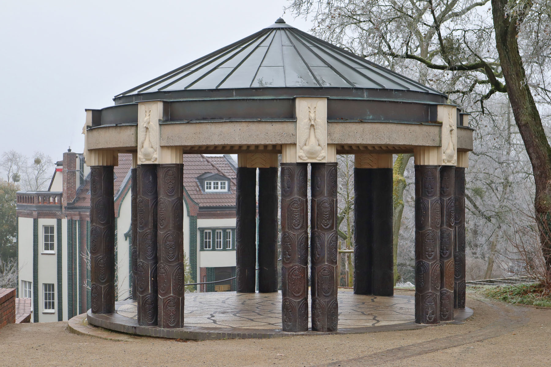 Ein weiterer Höhepunkt der Ausstellung war die künstlerische Ausgestaltung des schon um 1830 entstandenen Platanenhains, der dem Hochzeitsturm westlich vorgelagert ist. Der Bildhauer Bernhard Hoetger schuf hier ein in den Park eingebettetes Gesamtkunstwerk mit Skulpturen, Reliefwänden (Frühling, Sommer, Schlaf, Auferstehung) und Inschriftentafeln. Inhaltlicher Schwerpunkt der Werke ist das Thema Werden und Vergehen, der Kreislauf des Lebens. Hervorzuheben ist die Skulptur einer sterbenden Mutter mit Kind mit einem Sockel aus Löwenfiguren. Das Werk steht in der Tradition römisch-antiker Sarkophage. Das Motiv der Löwen flankiert auch die Brunnengruppe mit drei Wasserträgerinnen.