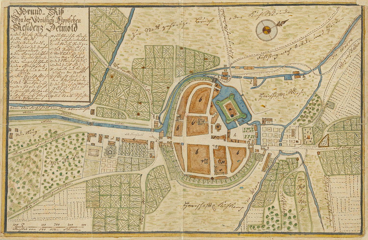 Der Schlossbezirk ist der dominante Komplex im historischen Baugefüge Detmolds. Die lippischen Grafen – ab 1789 Fürsten – bauten ihn im Laufe der Jahrhunderte repräsentativ aus. Rund um den Schlossvorplatz entstanden Remise, Marstall und Verwaltungsgebäude. Im 18. Jahrhundert durchbrach die Bebauung der Stadt den engen mittelalterlichen Mauerring. Unter Graf Friedrich Adolph wurde jenseits des Hornschen Tores die Neustadt angelegt. Ihr beherrschendes gestalterisches Element ist der Friedrichstaler Kanal, der beidseitig von Alleen und villenartigen Wohnbauten gesäumt wird. Weiterhin entstanden Regierungs-, Justiz- und Verwaltungsbauten und am Marktplatz ein neues Rathaus.