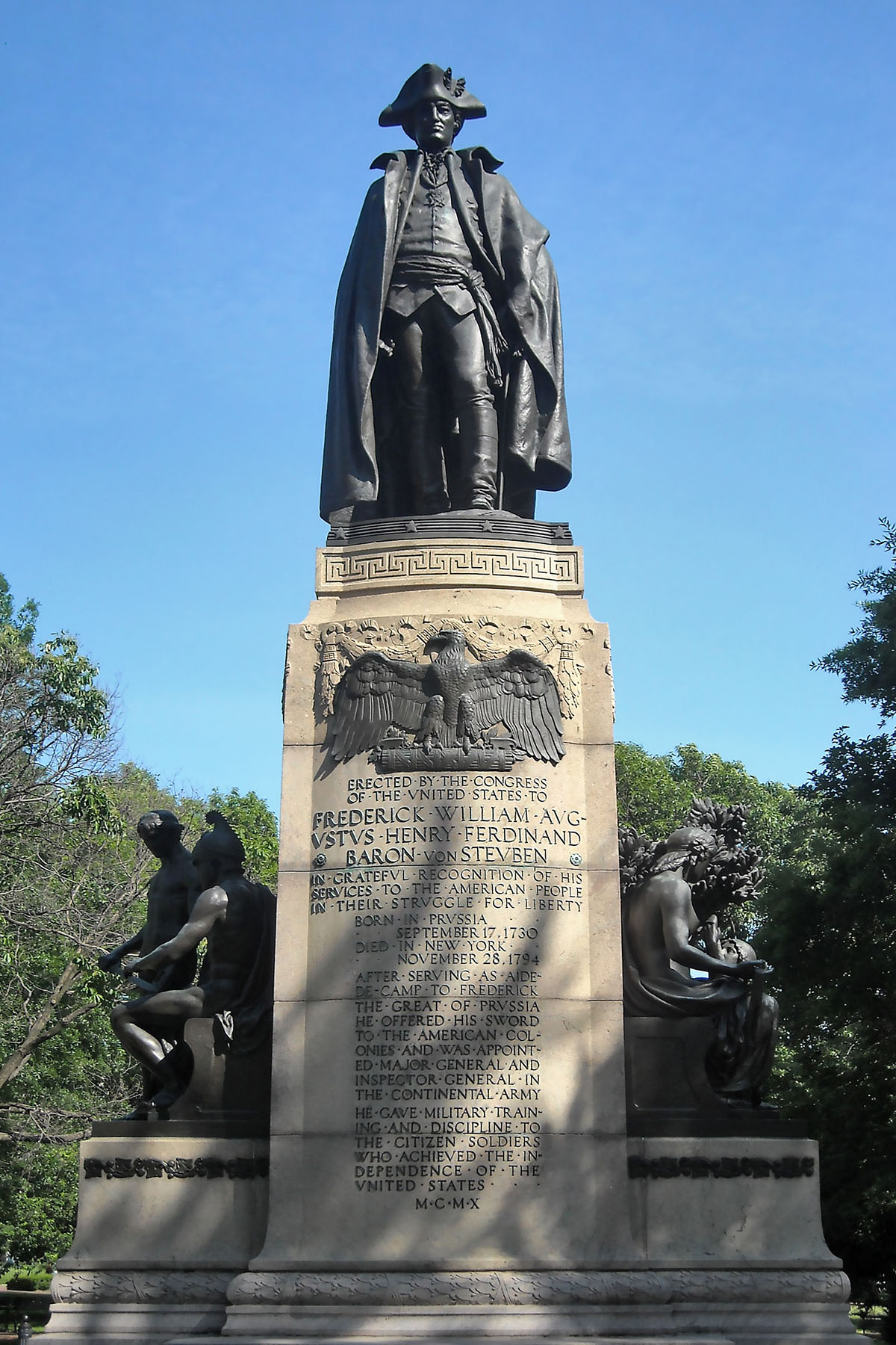 Dem Deutschen Kaiser und dem deutschen Volke gewidmet vom Kongress der Vereinigten Staaten von Amerika als Wahrzeichen ununterbrochener Freundschaft – Nachbildung des Denkmals für General Friedrich Wilhelm August von Steuben – geboren in Magdeburg 1730 – gestorben im Staate New York 1794 – errichtet in Washington in dankbarer Anerkennung seiner Verdienste im Freiheitskampfe des amerikanischen Volkes – MCMXI