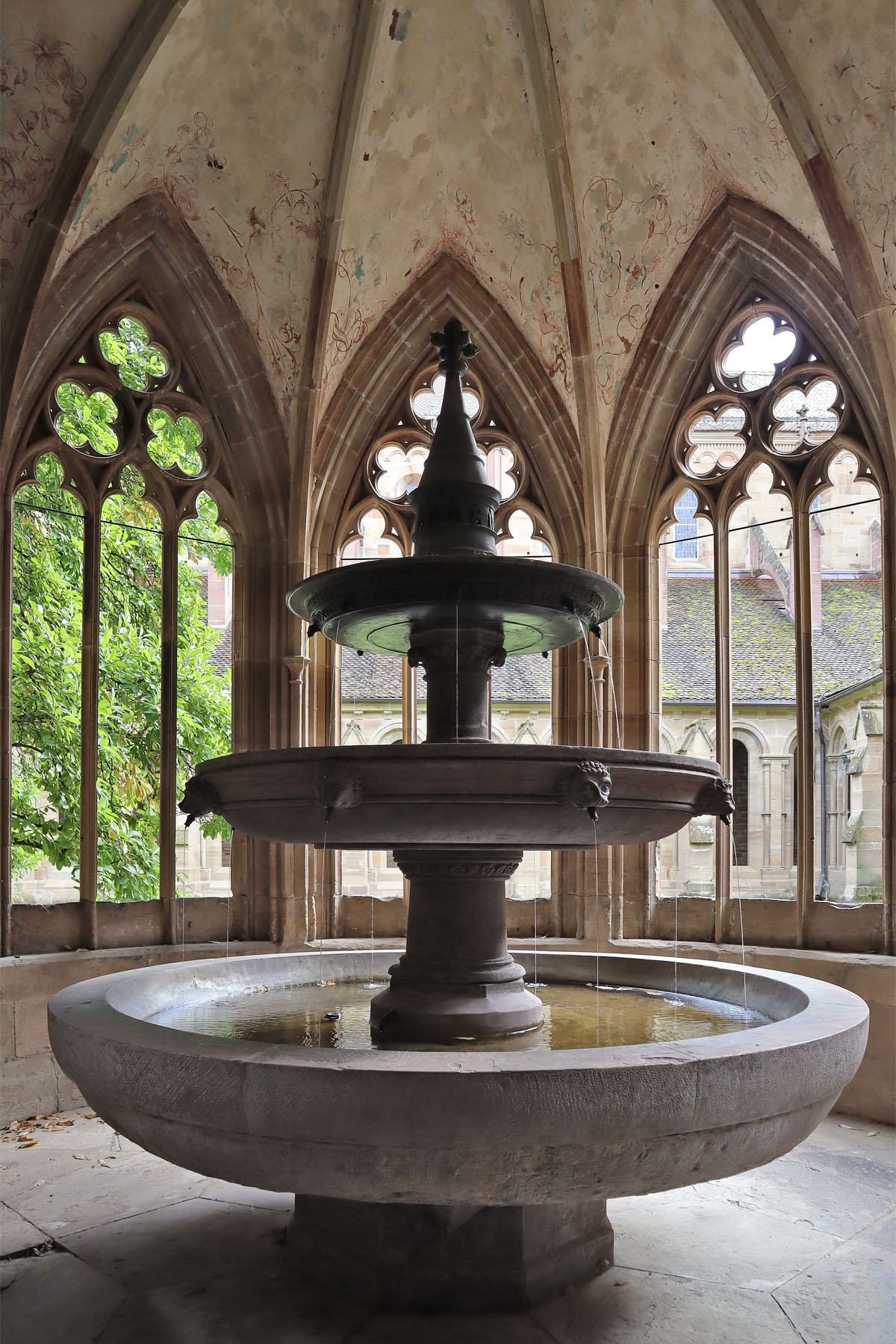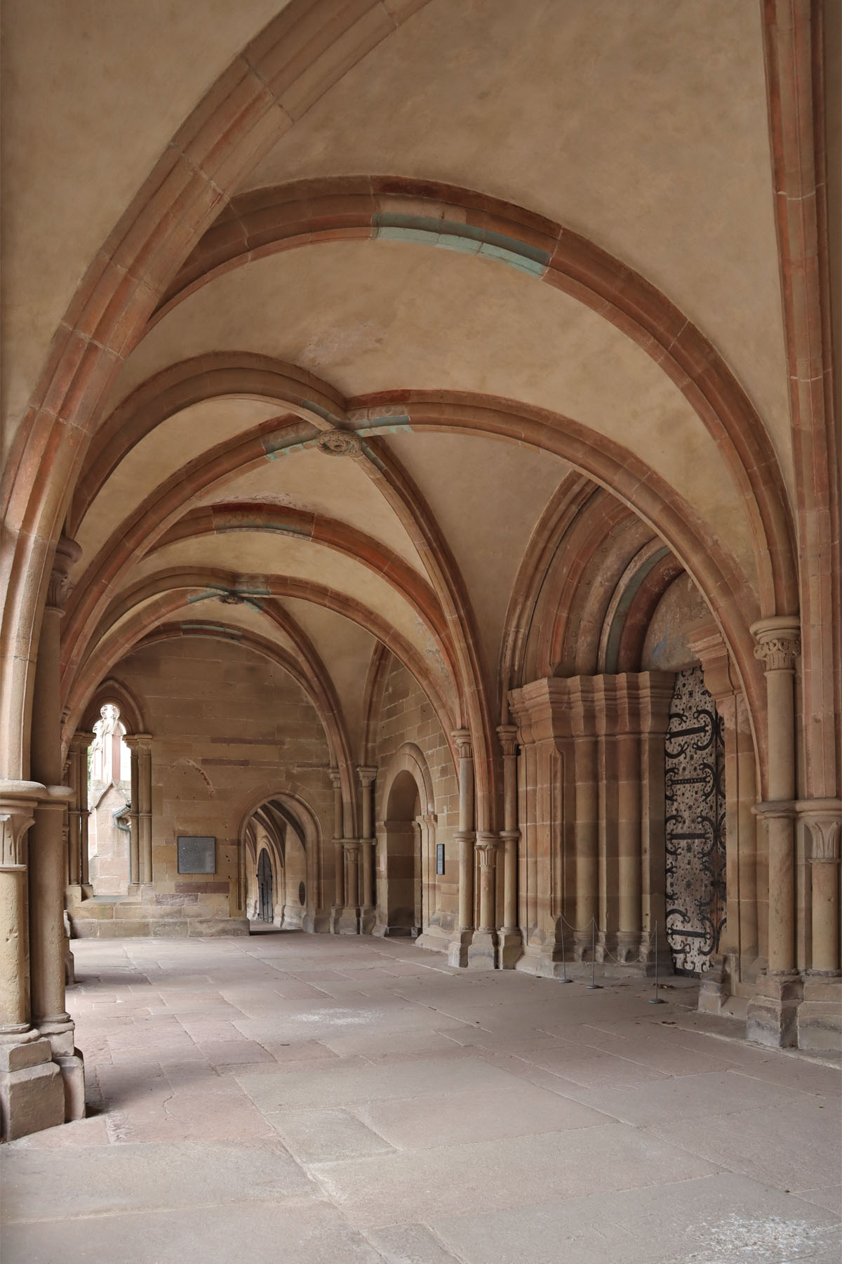Durch die Klosterpforte im Westen gelangt der Besucher in den Kreuzgang. Die Klausur ist in Maulbronn in seltener Weise nördlich der Kirche angesiedelt. Im Übrigen folgt der Komplex in romanischer und gotischer Formensprache dem zisterziensischen Klosterbauschema. Der zu Anfang des 13. Jahrhunderts im Süden begonnene und in großen Teilen hochgotische Kreuzgang ist mit dem erhaltenen Brunnenhaus und dem offen anschließenden Kapitelsaal zu den andächtigsten Bauleistungen um 1300 in Deutschland zu zählen. Das zeigt sich vorwiegend an den Konsolen, Kapitellen und den Öffnungen mit filigranen Maßwerkformen und Lanzetten. Es ist ein Genuss, die Würde dieses Ortes aufzunehmen.