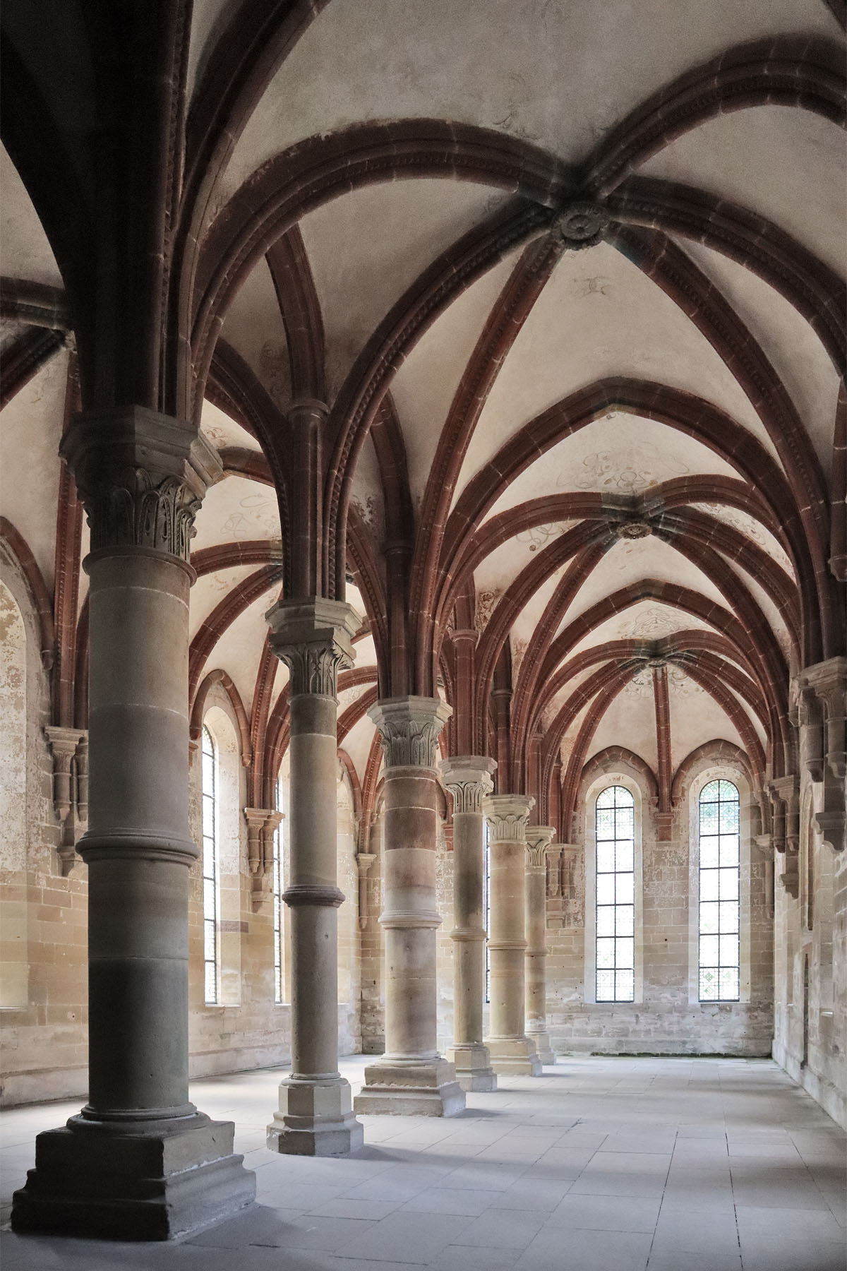 Einen weiteren Höhepunkt der klösterlichen Architektur in Maulbronn stellt das Herrenrefektorium, der Speisesaal der Priestermönche, dar. In seinen Außenmauern mit schlanken Rundbogenfenstern noch spätromanisch angelegt, zeigt sich im steilen Inneren eine Formensprache, die die beginnende Frühgotik um 1220/30 verkörpert. Haupt- und Nebenstützen mit Schaftringen teilen den Raum in vier Doppeljoche, die mit einem schweren, sechs- bzw. siebenteiligen Rippengewölbe versehen sind. Die hohen Fenster, die das Refektorium zu einem lichtdurchfluteten Raum machen, geben ihm die Würde einer prachtvollen Königshalle.